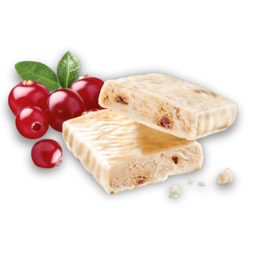 Mléčný protein, kolagenní hydrolyzát, 16% bílá čokoláda se sladidlem (sladidlo maltitol, kakaové máslo, sušené mléko, emulgátor sójový lecitin, aroma), voda, zvlhčovadlo glycerol, palmový tuk, 2,5% sušené slazené brusinky (brusinky, cukr, slunečnicový olej), okyselující prostředek (kyselina citronová), aroma, sladidlo (sukralóza, acesulfam-K).